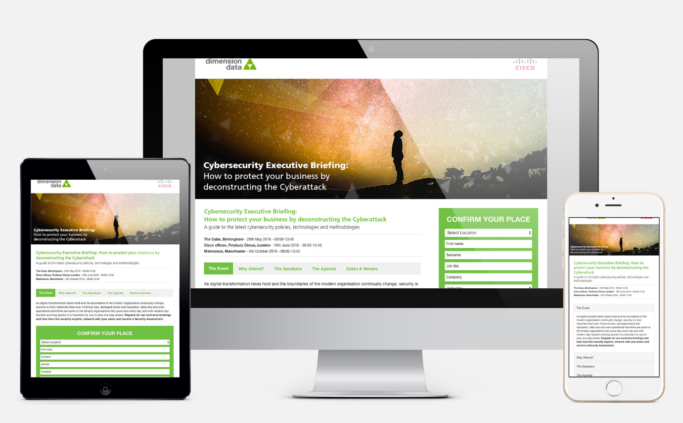 Another aspect we help with is the design and build of microsites for the various educational events that Dimension Data hold. The microsites offer information on each event, but more importantly, provides a means by which participants can register themselves. We built the microsite from the ground up, creating a bespoke solution. The microsites were designed while keeping within brand guidelines, and were built to be responsive to ensure ease of use across all devices.