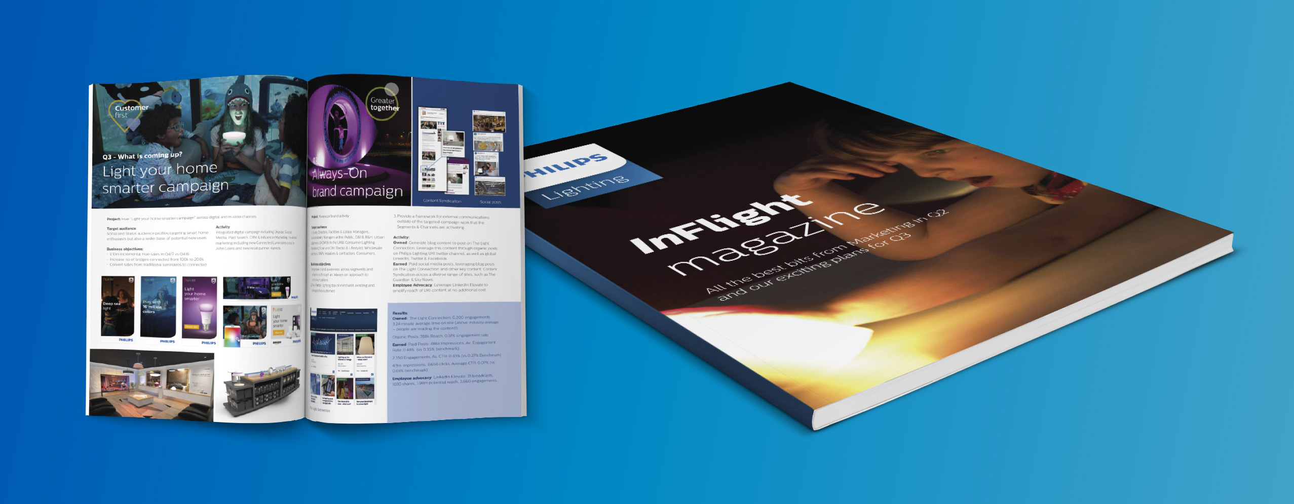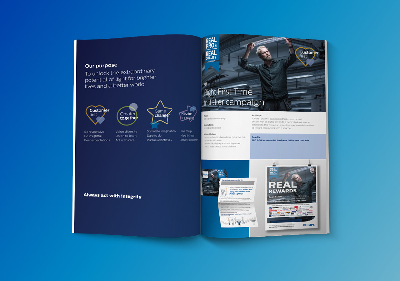 Pelling Design were asked to design and create a overview of Philips Lightings successful marketing campaigns covering the last 12 months and also outlining what the next 12 months hold.